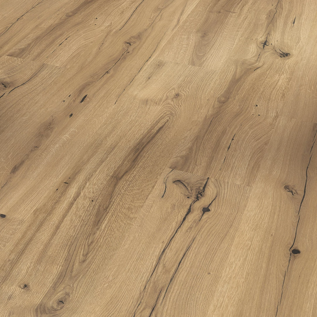 A Basic 400 termékcsalád Parador Laminate Oak Chronicle Wide Plank padlója minden tekintetben lenyűgöző. Ez a laminált padló kifinomult érzetet kelt, tartós és megfelel a legmagasabb terméktervezési szabványoknak. A padló széles padlóként 1285 x 194 x 8 mm méretben kapható. Az illesztésmentes kialakítás nyugodt, egységes összhatást kelt, mivel nem láthatók rések. A laminált padló selymes matt textúrája különösen természetes megjelenést kölcsönöz. A nyugodt és harmonikus textúra vizuálisan a kezeletlen fára hasonlít. A Parador Basic 400 termékcsaládjának laminált padlói alacsony kibocsátású allergéneket tartalmaznak, tartósak, egészségesek az otthon számára, és kivételesen könnyen karbantarthatók. Padlófűtés fölé is lerakhatóak. Ennek a laminált padlónak a beépítési magassága 8 mm. A szabadalmaztatott SafeLock® PRO klikkcsatlakozóval ellátott klikkmechanizmusnak köszönhetően ezek a padlók precízen és egyszerűen lerakhatók. A teljes felületű élimpregnálás megbízható védelmet nyújt a duzzanat ellen. A gyártó magánhasználatra tizenkét év garanciát vállal.