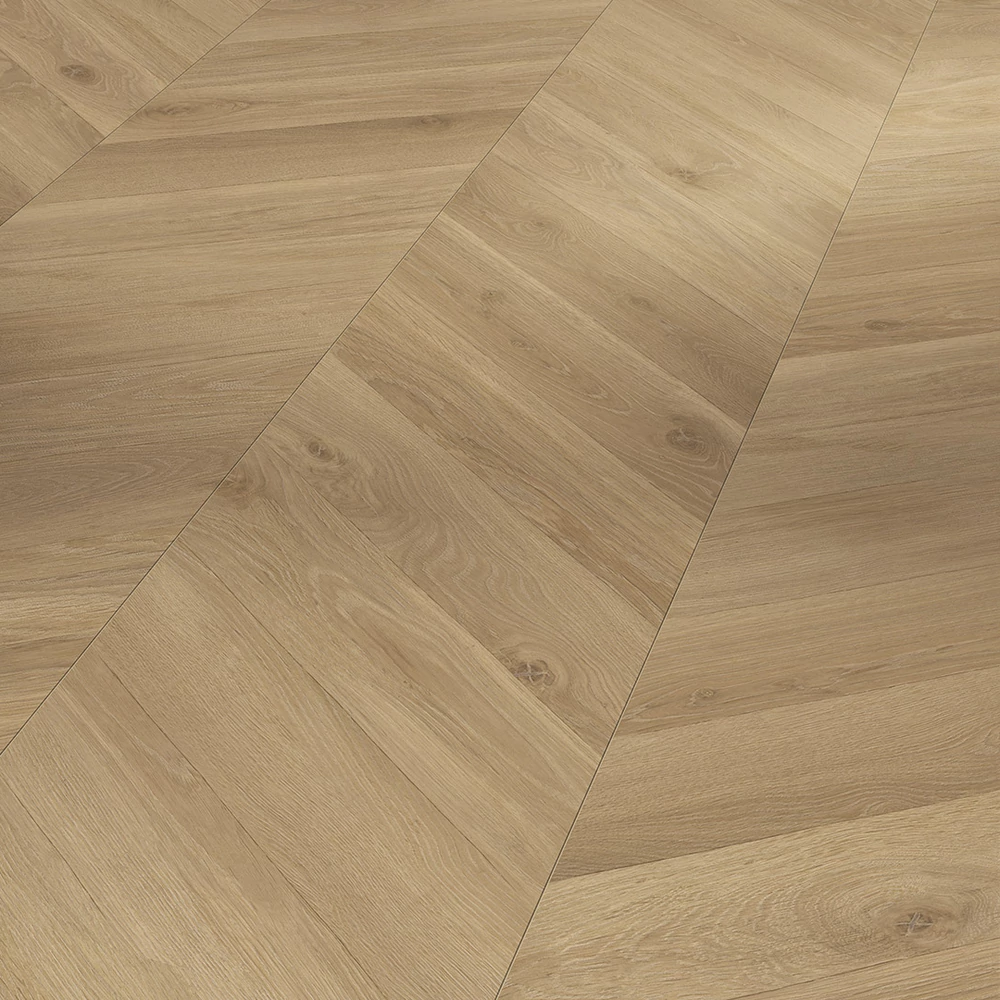 A Trendtime 8 termékcsalád Parador Oak Loire méz színű laminált padlója lenyűgöző a teljes termékcsaládon belül. Hagyományos chevron mintázatban, 1285 x 330 x 8 mm méretben kapható, ez az elegáns laminált padló időtlen tölgyfa dekorjával tűnik ki. A matt felületű textúra különösen természetes megjelenést kölcsönöz a padlónak, nyugodt, harmonikus megjelenése pedig a kezeletlen fára emlékeztet. Az illesztésmentes kialakítás egységes felületet hoz létre, amely különösen nyugodt és kiegyensúlyozott hatást kelt. A termékcsalád padlója elegáns, élő designt ígér, és kiemelkedő minőségével lenyűgöző. A chevron mintázatban lerakott laminált padló jelenleg a padlódesign egyik abszolút trendje. A SafeLock® PRO kattintásos rendszernek köszönhetően a Trendtime 8 termékcsalád laminált padlója könnyen lerakható – akár padlófűtésre is. Rendkívül tartós és mikrokarcálló. A speciális Aqua-Proof maglemez lehetővé teszi a padlóburkolat nedves helyiségekben, például konyhában vagy fürdőszobában történő használatát is. Ezenkívül a padlóburkolat kiváló duzzadás elleni védelemmel rendelkezik a körkörös élimpregnálásnak köszönhetően. A Trendtime 8 termékcsalád laminált padlói olyan kiemelkedő minőségűek, hogy otthoni használatra szánt padlóburkolataira élettartamra szóló gyártói garanciát vállalunk.
